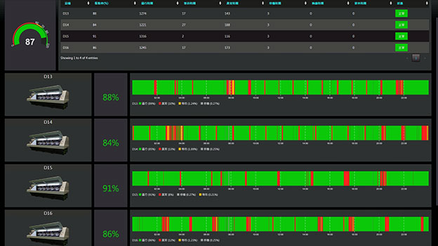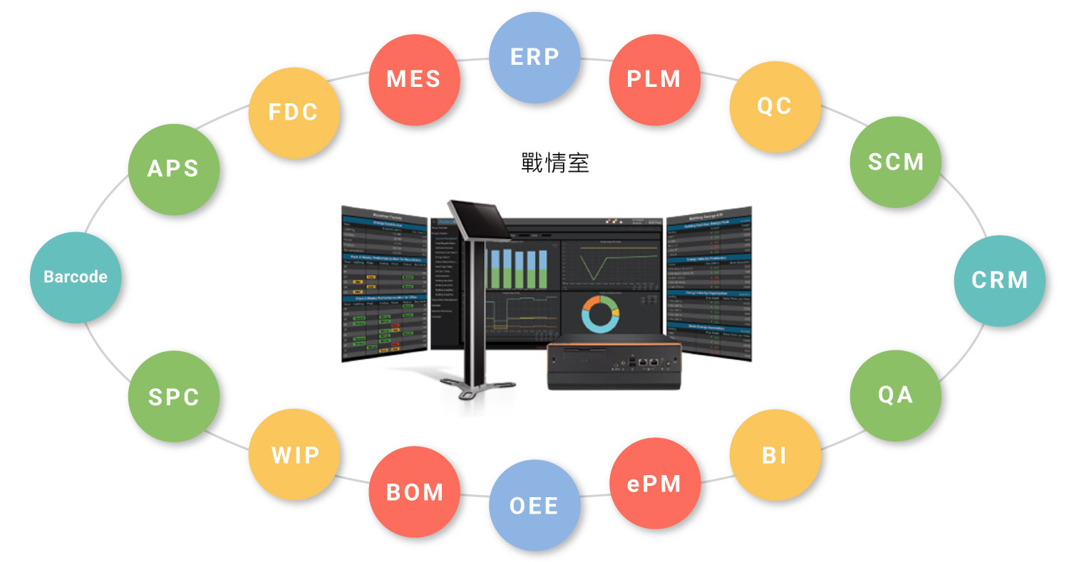 整合客戶工廠多平台數據,如MES、ERP、PLM、BI等,透過工廠看板或中控室,即時呈現出現場人、機、料的動態,透過大量的數據採集,讓企業的數據化管理達到最佳效益戰情室四大功能