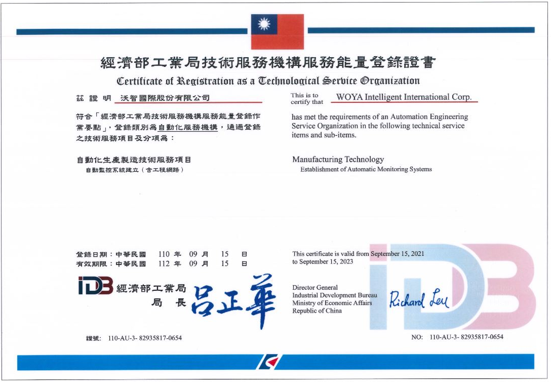 沃智國際通過經濟部工業局技術服務機構能量登錄 沃智國際通過經濟部工業局專業技術能力、執行管理能力及財務健全度審核,獲得經濟部工業局技術服務機構服務能量登錄認證在自動化系統整合規劃技術服務認證項目中,取得自動化生產製造技術服務項目(自動監控系統建立含工程網路)認證,肯定沃智國際在工商企業產業和政府間所累積之自動監控系統、生產技術、工程網路服務的實力。 謝謝經濟部工業局給予沃智國際在自動化領域的肯定。